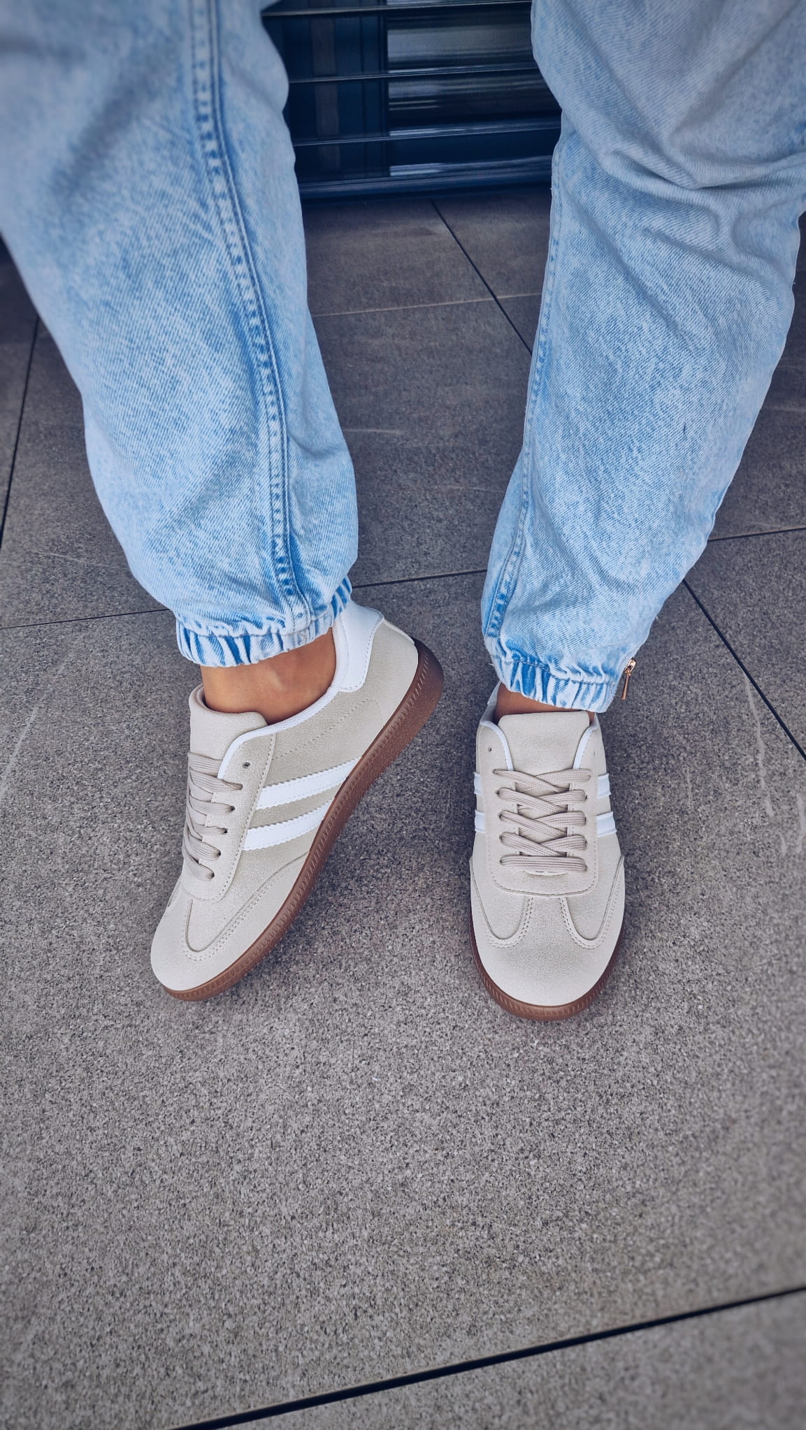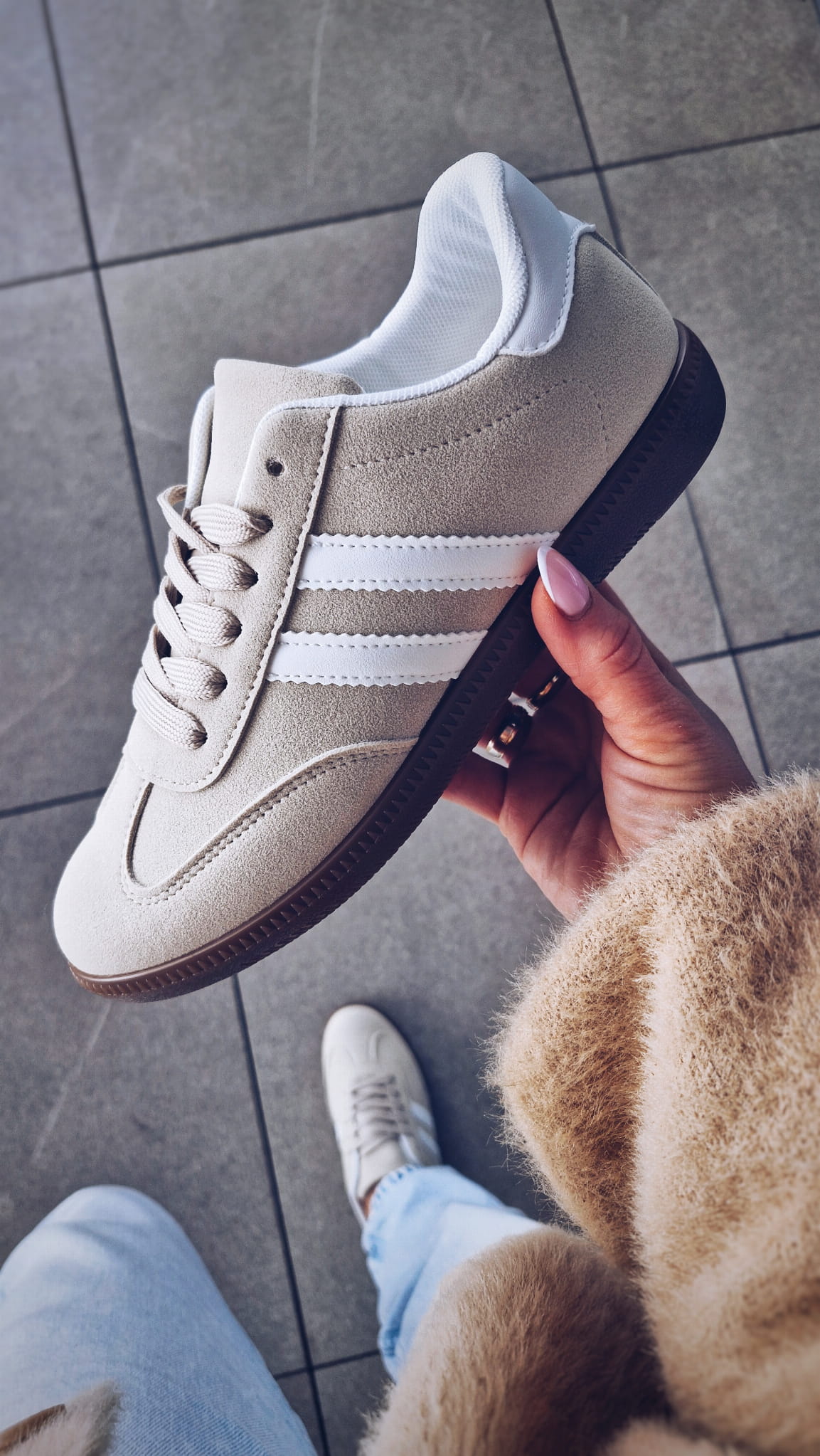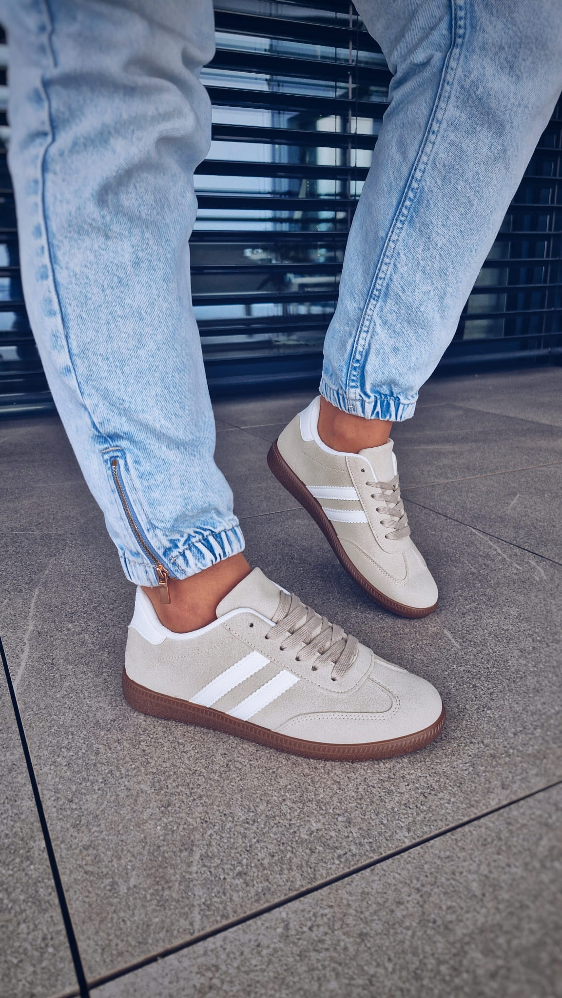Beżowe sneakersy z białymi paskami to kwintesencja miejskiego szyku i wygody.