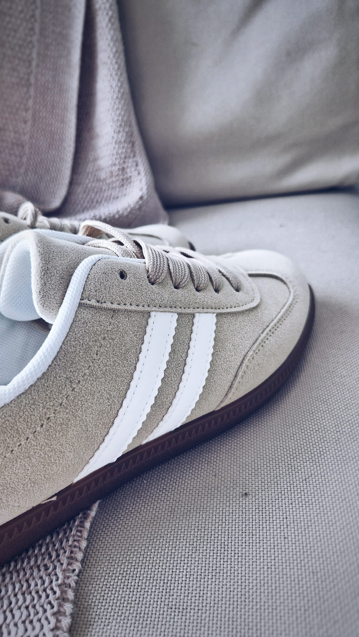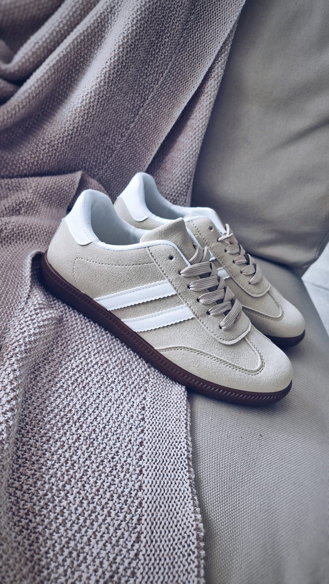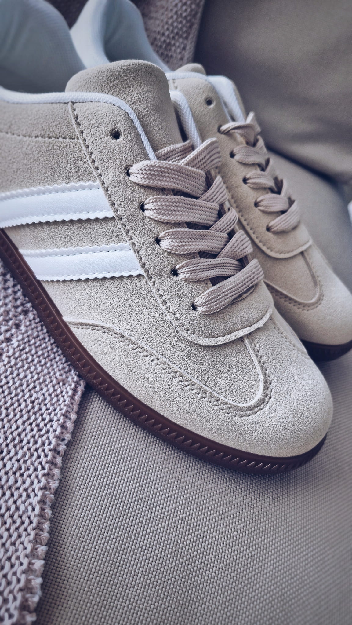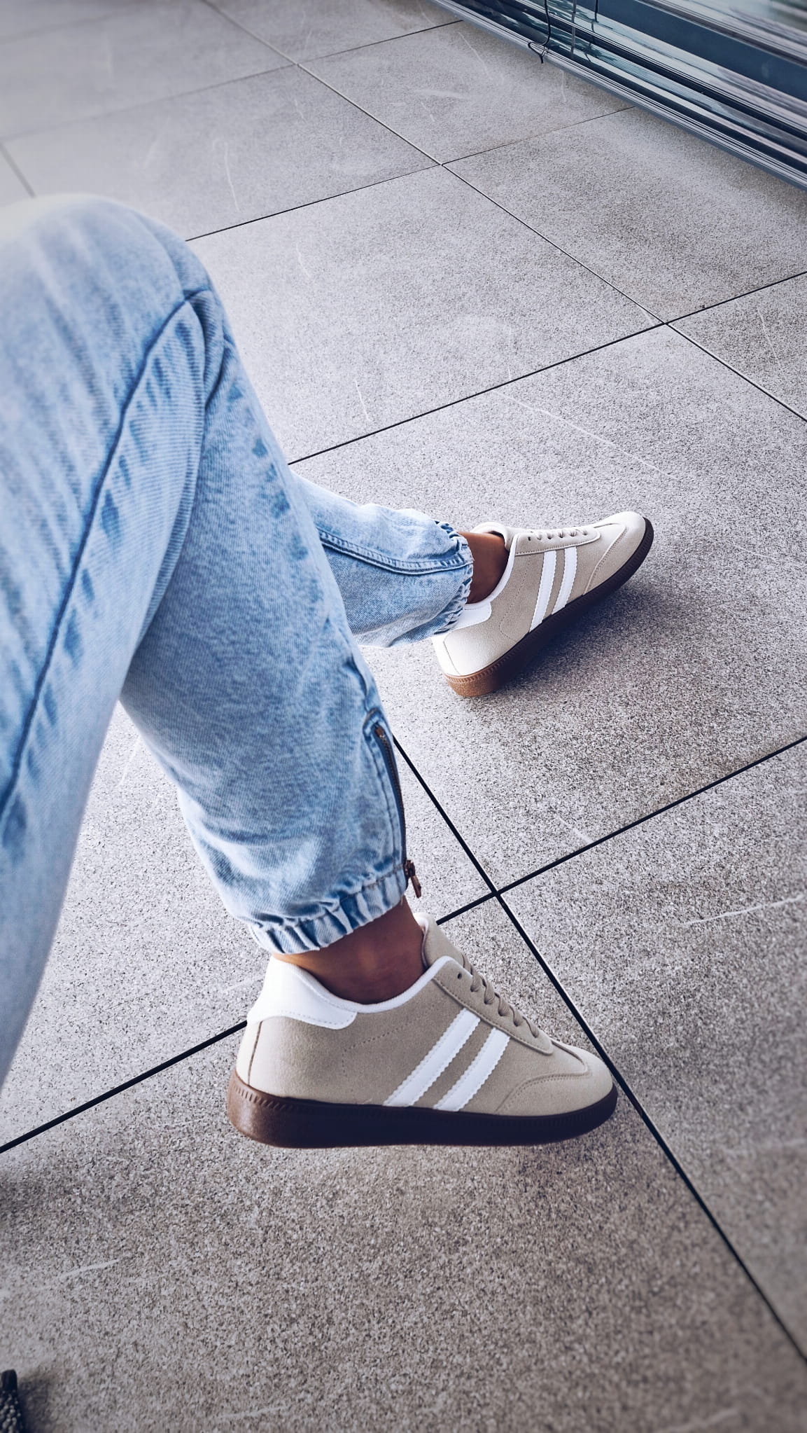 Beżowe sneakersy z białymi paskami to kwintesencja miejskiego szyku i wygody.