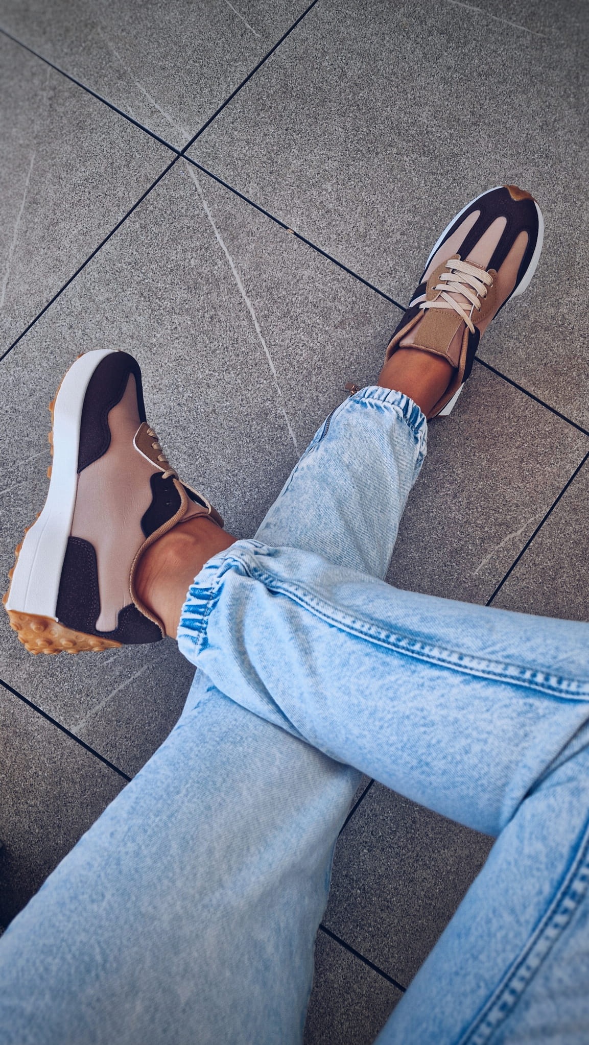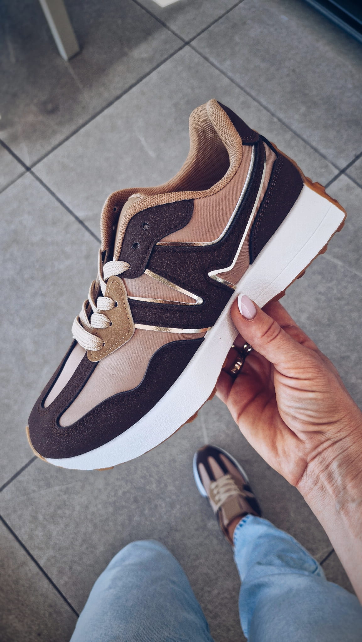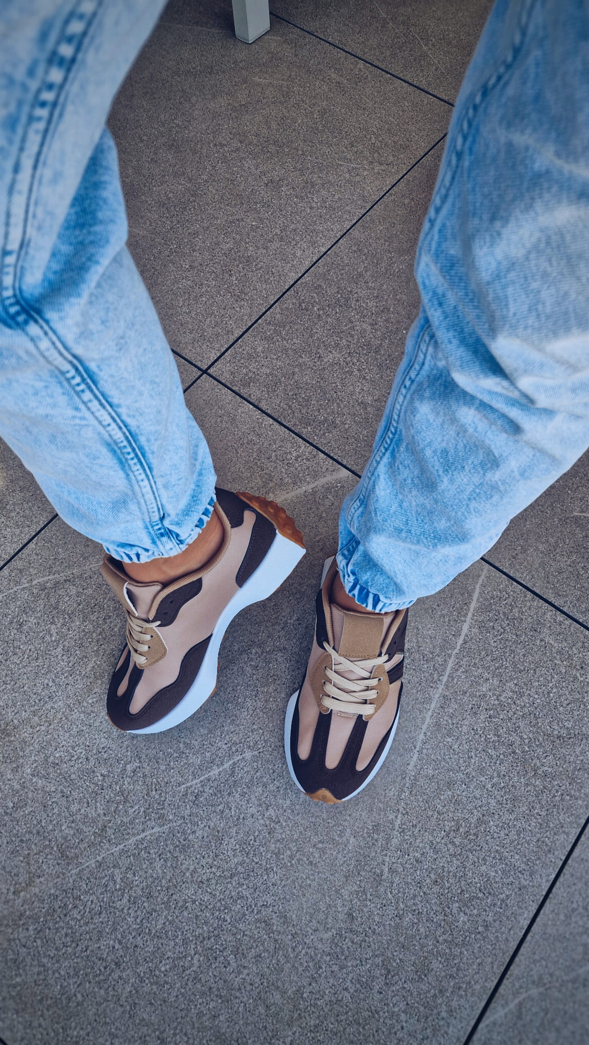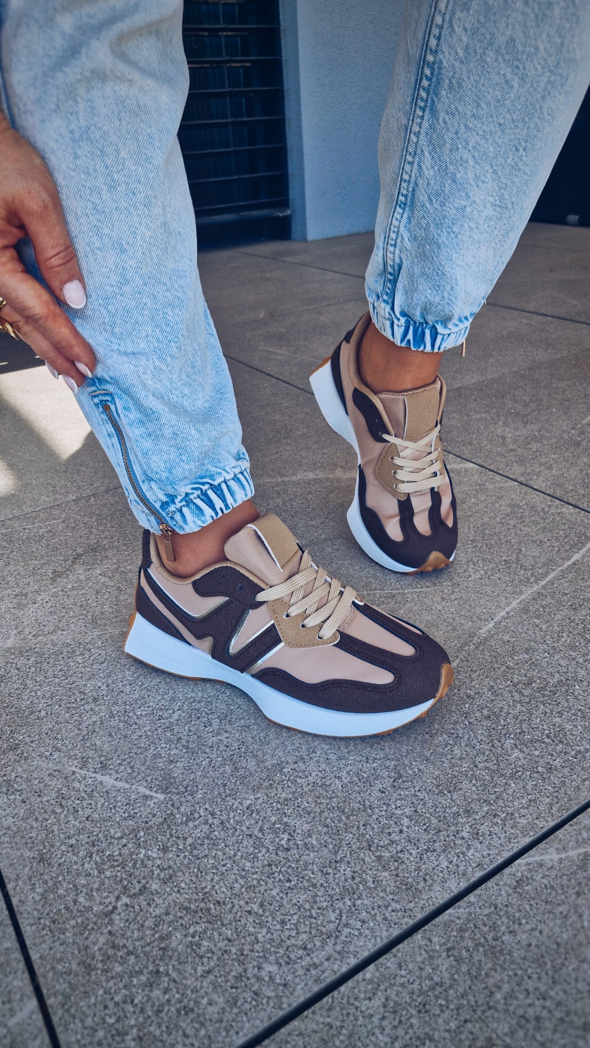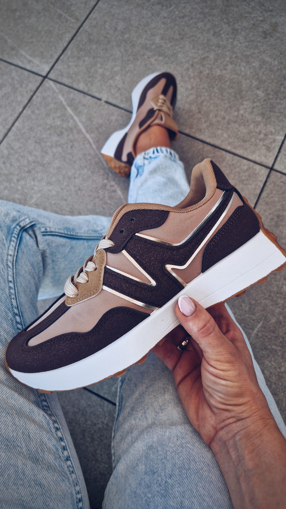 Te beżowe sneakersy z białą podeszwą